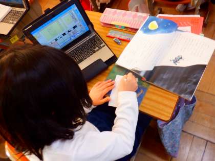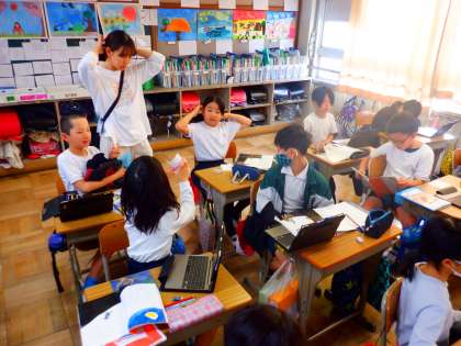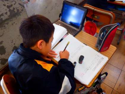 国語の授業の様子です。もちもちの木の登場人物のキャラクターについて、タブレット端末を使ってまとめています。登場人物である豆太の顔を挿絵から選んで描いていました。キャラクターが表れている絵を描き、タブレット端末に取り込むそうです。