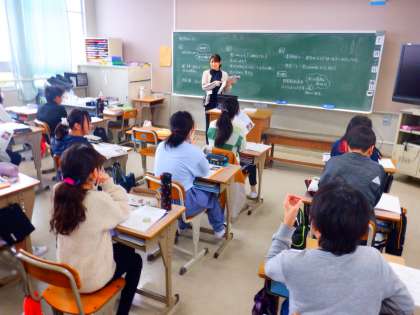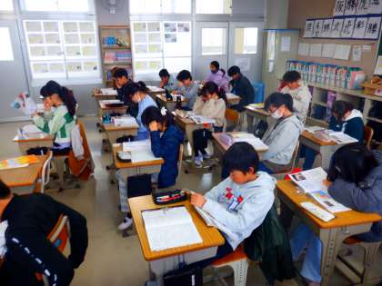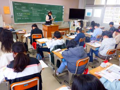 社会の授業の様子です。日中戦争や第二次世界大戦がおこるなか、戦争中の人々のくらしについて、衣食住の視点で当時の様子を想像していました。