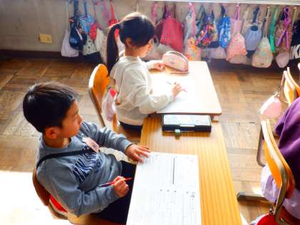算数のテストをするそうです。事前に習ったことをプリントで振り返っていました。