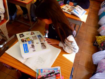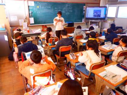 社会の授業の様子です。堺市のうつりかわりの様子を昔の写真を見ながら今との違いを考えていました。