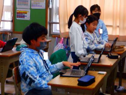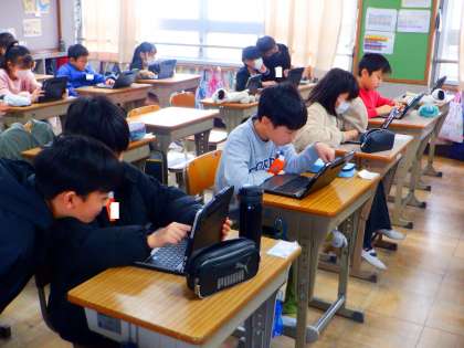 社会の授業の様子です。今日は、堺市で自分が住んでみたいところについて、友だちの意見を聞きながら調べています。その後、防災の安全面等についても調べるそうです。それらの情報をもとにみんなはどんなところを選ぶのかな。