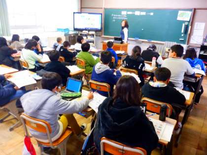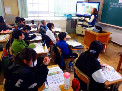 外国語の授業の様子です。場所を示す言葉(前置詞)について学習しています。前につく言葉によって場所が異なることに気づくことができました。