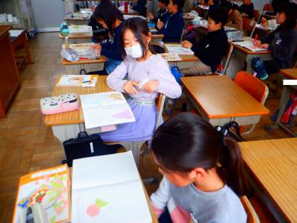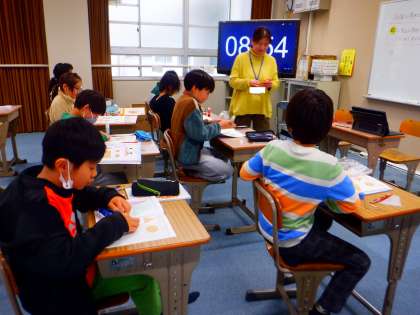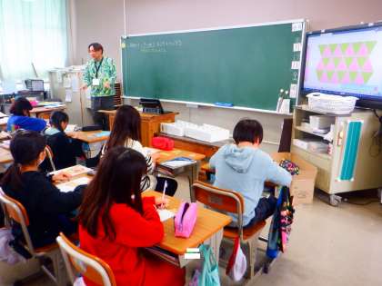 少人数クラスの算数の様子です。今日は、三角形をしきつめいろいろな模様を作っています。すき間をあけずにびっしりとしきつめ、鳥や花、ハートなど思い思いのものを作っています。