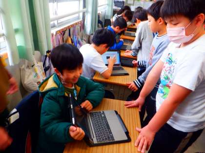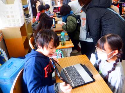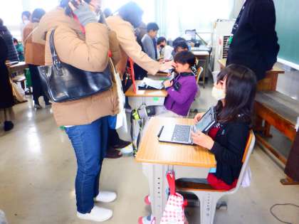 今日は、3年生最後の参観です。今日は、それぞれが成長したことについて、パワーポイントを使いながら説明しています。「はばとびをとぶことができたよ」「外国語を話すことができたよ」「漢字を頑張ったよ」等友だちや保護者に説明していました。