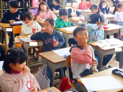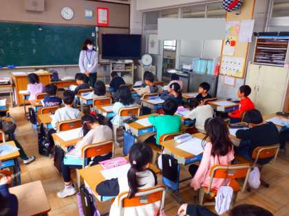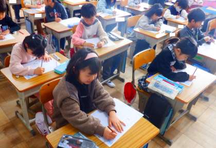 書写の授業の様子です。専科の先生に教わっています。何か楽しいお話をしていたのでしょうか。にこにこしながら書き方の学習に取り組んでいました。