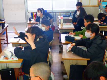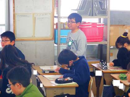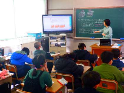 算数の授業の様子です。厚さ1cmの板を使って本棚をつくるときの、内側の横の長さと本棚の横の長さを調べました。差が一定の変わり方をしていることに気づき、それを式に表そうとしました。
