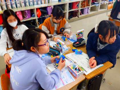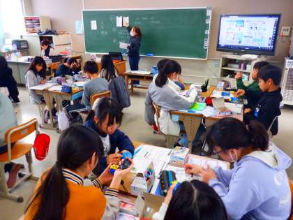 理科の授業の様子です。発電した電気を蓄え、光や動きに変換する実験をしました。条件をかえると光る時間や動く時間に変化があるのか予想し、実際に確かめています。
