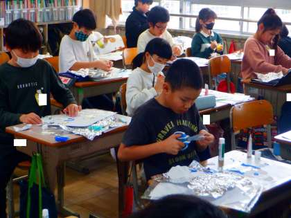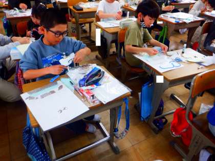 図工の時間の様子です。今日は、跳びを飛んでいる様子を版画に表しています。材質や模様が異なる用紙等を組み合わせて作成していました。「とび箱や帽子、体操服を工夫したよ。」と教えてくれました。