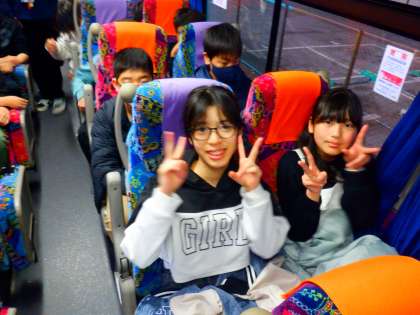 出発式とバスの中の様子です。朝早く出発したので少し眠そうに見えます。