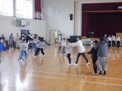 学習参観終了後、親子交流会をおこないました。親子一組になってしっぽとりゲームをしています。時間がたつにつれて少しずつコートが小さくなり、徐々に逃げる場所がなくなっていきます。とても白熱していました。企画、運営をしていただいた学年代表の皆様、ありがとうございました。