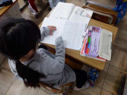 国語の授業の様子です。物語文を読んで感想を書きました。「かなしい」「どうしてかというと」のように、自分の感情に、その理由を添えて書こうとしています。