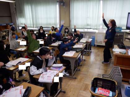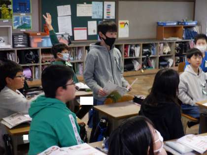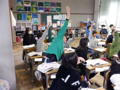 外国語の授業の様子です。ある人物について英語を使ってヒントを出し、その人物を英語で答えるという活動をしています。答えがわかると積極的に手をあげ、答えようとする姿が見られました。