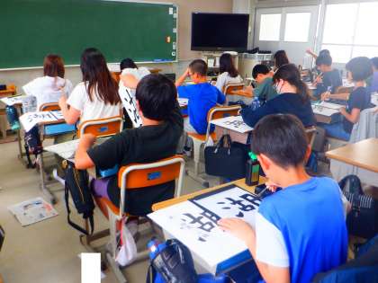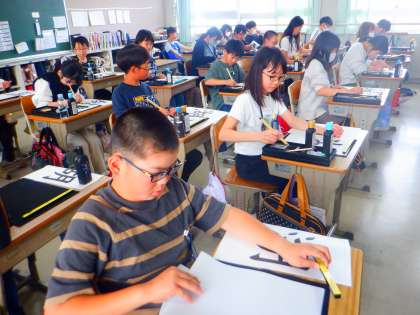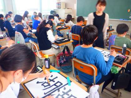 書写の授業の様子です。今日は、「湖」にチャレンジしています。1文字ですがそれぞれのバランスに気をつけて、しっかり筆を運んでいます。静かな時間が流れていました。