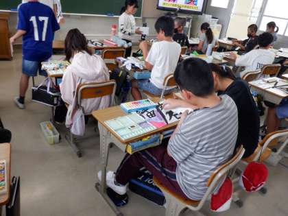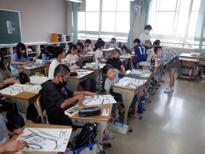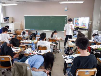 デザイン画を作成しています。思ったことをイメージして作品を作ったり、また、技法もいろいろな方法で表現してみたりと面白い作品に仕上げようとしています。いい作品が仕上がるといいですね。