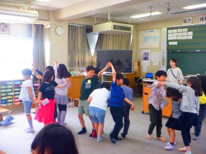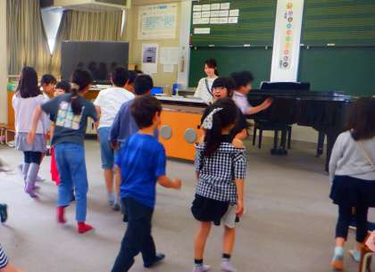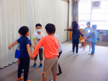 音楽の授業の様子です。今日は、音楽にあわせて動きました。その後、音の数にあわせて、なかまを集めました。集まったなかまで、「なべなべそこぬけ」をしました。「〇〇さん、こっちにおいで」と声をかけあす姿がすてきでした。