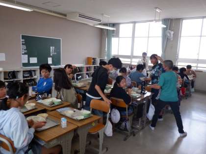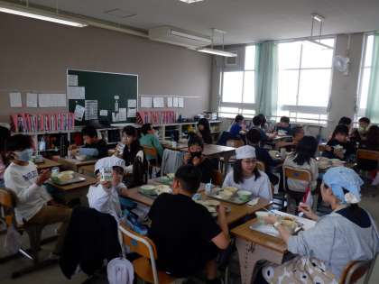 6年生はみんなで楽しく給食を食べています。今日のお味はどうだったでしょうか。6年生は準備も早く、他学年より早く食べ始めているようです。さすがです。