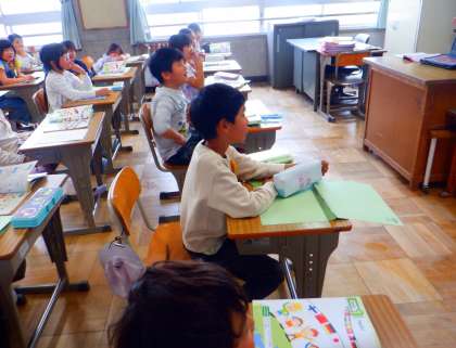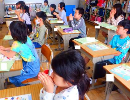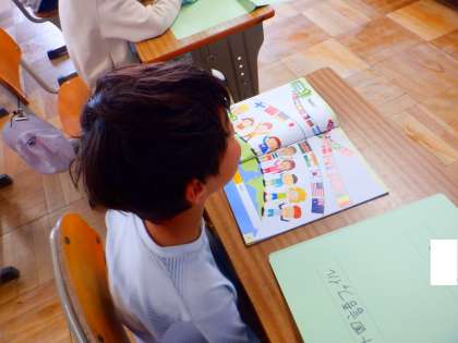 外国語活動の様子です。今日は、あいさつを学びました。中国やアメリカ、インド、韓国、ジャマイカなど様々な国のあいさつを聞き、みんなで発音しました!!