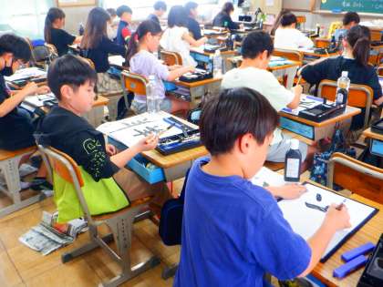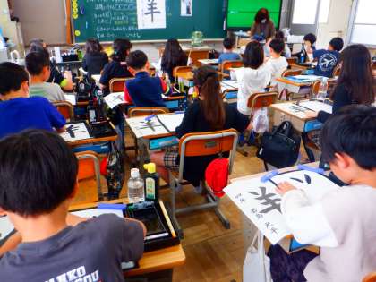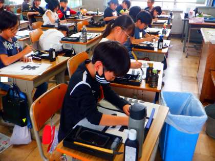 書写の授業の様子です。今日は、毛筆で「羊」をかきました。横画が同じ間隔になるように気をつけて書きました!!集中して、最後までかきました。