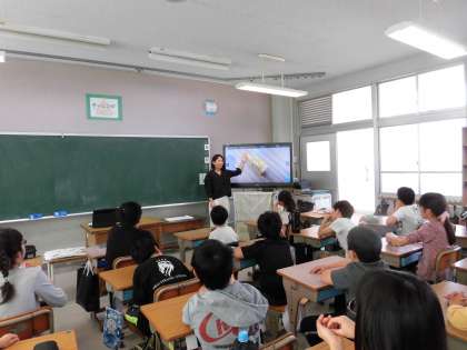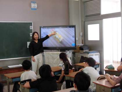 1立方センチメートルのブロックがおもしろい形に積み上げられています。問題がテレビに投影されると、集中して問題を見つめている5年生。さすが、高学年です。