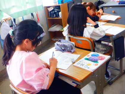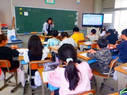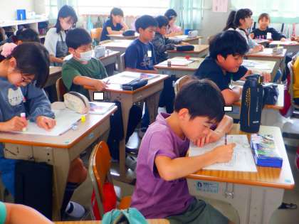 算数の授業の様子です。今日は、体積を求めています。まずは練習問題からチャレンジしました。