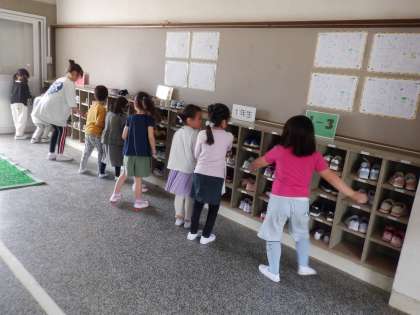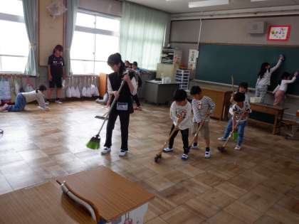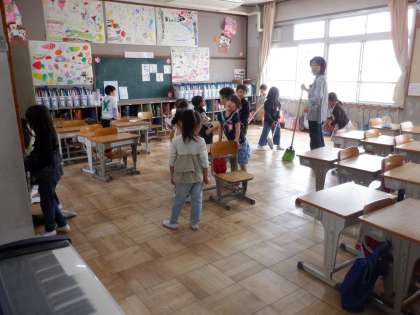 給食の後も1時間学習があります。そのため、初めての清掃活動も行いました。教室だけでなく廊下や靴箱などもきれいにしてくれました。先生だけでなく6年生のお兄さん、お姉さんも手伝ってくれています。