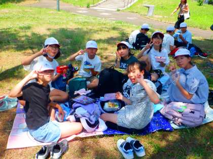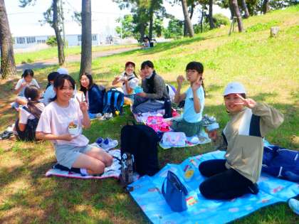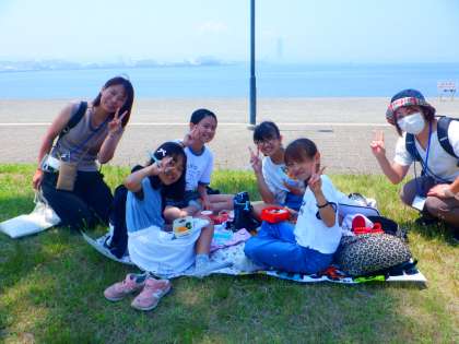 海の見える広い公園で,のんびりみんなでお弁当を食べました。