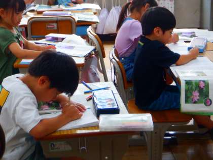 国語の授業の様子です。今日は、『つぼみ』という説明文の問いと答えを見つけました。教科書の文章をよく読んで見つけ、ノートに書き写しました。どちらも見つけることができましたか。
