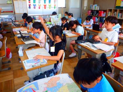 社会の授業の様子です。今日は、公共しせつについて勉強しました!!先日の校外学習でも見学した市役所や図書館などみんなが使う場所について、堺市の地図やタブレット端末を使いながら調べました!!
