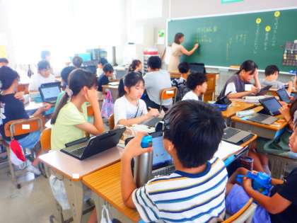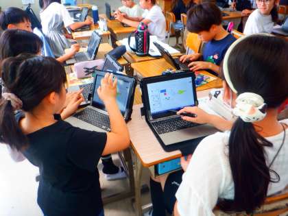 今日は、タブレット端末の「パワーポイント」を使い、共同編集しながらグループで絵しりとりをしました!!共同編集の機能を他の教科でも活用できるといいですね!