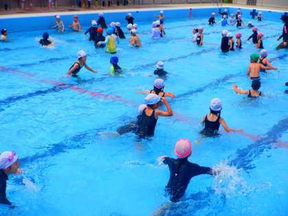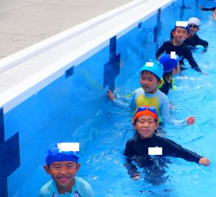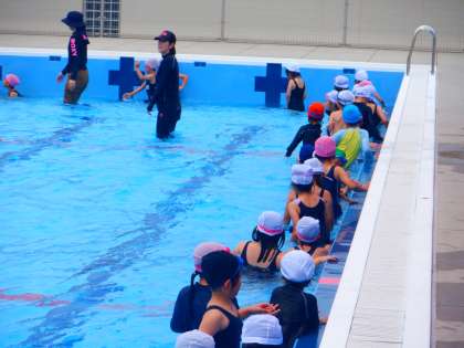 今日は、待ちに待ったプールの日です!!プールに入る時のルールをしっかり守って素晴らしいです!プールサイドを持ちながら歩いています。また、象やペンギン、うさぎになってプールの中でジャンプしたり、体を動かしました。とっても楽しそうでした!!
