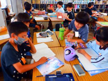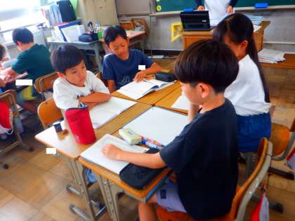 国語の授業の様子です。今日は、筆者がなぜ『1つの花』と題名をつけたのかについて考えました。登場人物が「1つの・・・」と言うからではないかなどグループで話し合い共有しました!