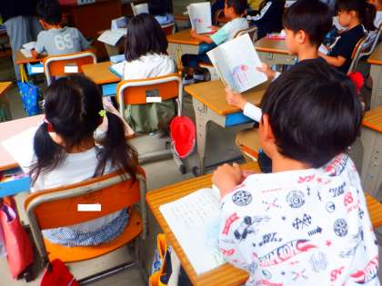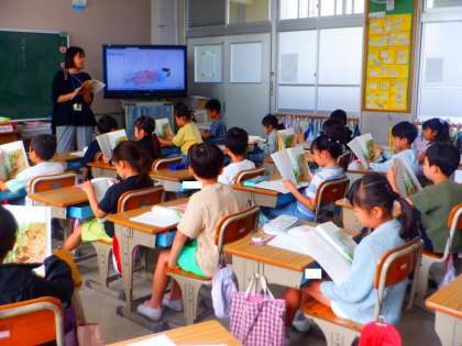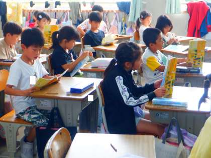 国語の授業の様子です。今日は、みんなで「スイミー」を一文読みをしました。文章を追って、順番が来たらスッと読むことができました。スラスラと、しっかりした声で読みました!!