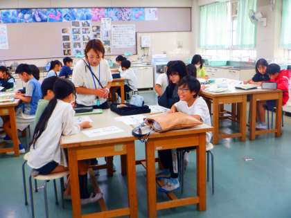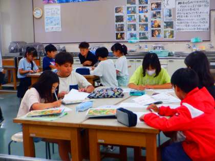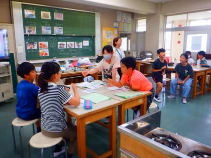 家庭科の授業の様子です。今日は、来週の調理実習に向けて「ふかしいも」の調理の仕方や役割分担を決めました!!包丁やまな板、ピーラーなどの調理器具を使うのははじめてですね。安全に使ってくださいね。
