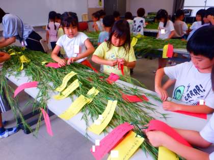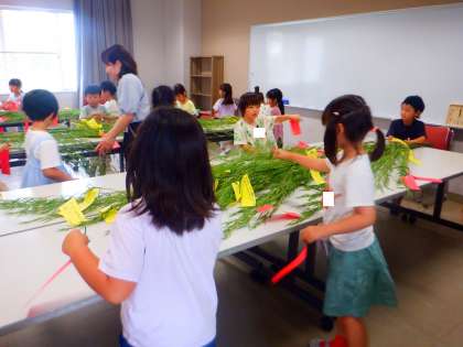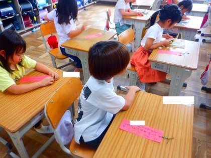 生活科の授業の様子です。今日は、短冊に願い事を書きました。将来の夢やがんばりたいことなどを書いていました。そして、「願いが叶いますように!!」と笹の葉に短冊をつるしました。