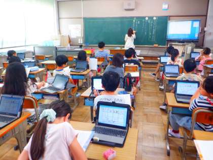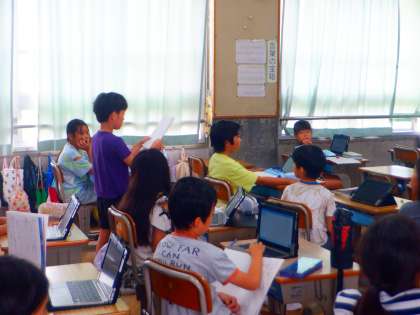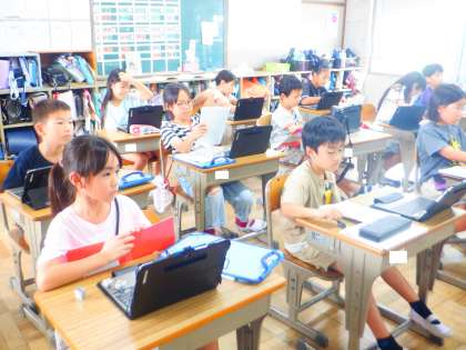 国語の授業の様子です。今日は、それぞれが書いた心情曲線をみんなで見せ合いました。自分と比べて、「この場面で心情曲線があがってるので聞いてみたい!」「自分と〇〇さんと違ったから聞いてみたい」などの意見が出ていました。