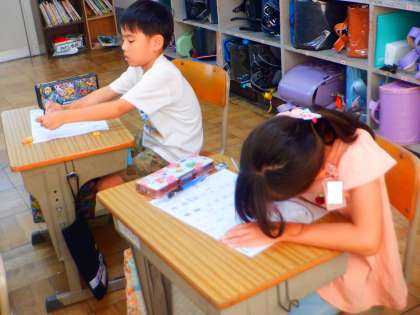 書写の時間の様子です。今日は、文字の形に気を付けながら練習しました。紙をしっかりおさえ、画の方向や画と画の間のバランスにも気を配っていましたよ。