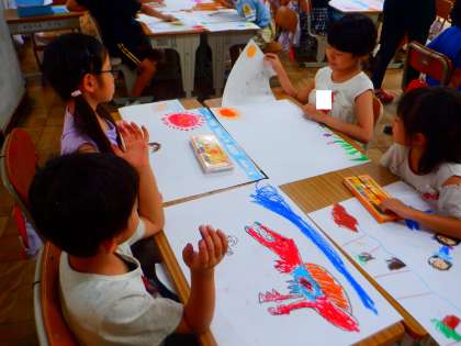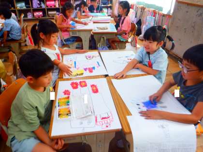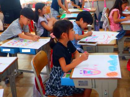 図工の授業の時間です。今日は、こんなことをしてみたいなぁと思うことを絵に描きました!!「大きなケーキの上に乗ってみたい!」「ユニコーンに会ってみたい!!」など想像を広げながら楽しく描きました。そして、グループで伝え合いましたよ。