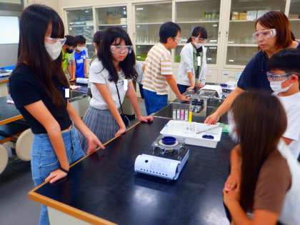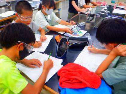理科の授業の様子です。今日は、5種類の水溶液を区別するにはどうしたらよいのかを考えました。まずは、食塩水です。コンロを使い、食塩水を蒸発させました。少し離れて様子を「白い粒が見えてきた。ぱちぱちしてる。」と観察しました。