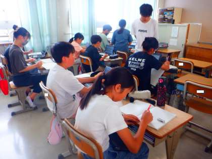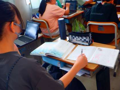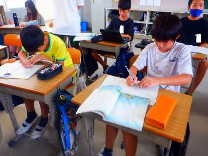 国語の授業の様子です。今日は、やまなしの5月の文章を読みながら描きました。「『クラムボン』てなんだろう?調べてみよう。」と前後の文章の流れや意味をとらえながら書きました。