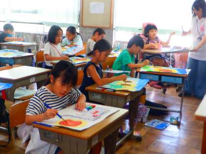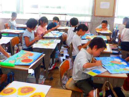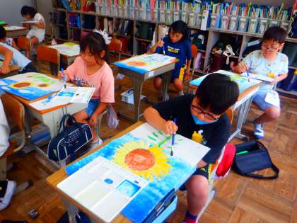 図工の時間の様子です。今日は、ひまわりの色を塗りました。グラデーションを出しながら背景の色を、トントンと筆を置きながら塗りました。また、ひまわりのお花の細部まで頑張りました。