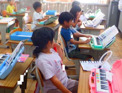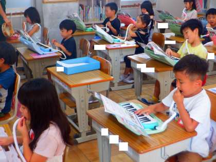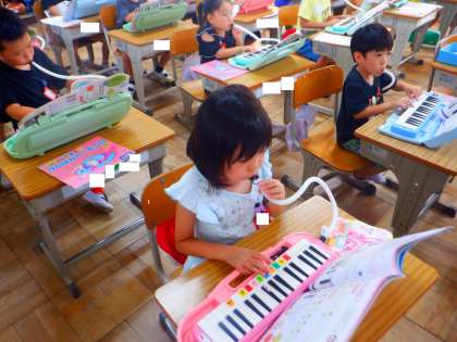 音楽の授業の様子です。今日は、鍵盤ハーモニカを使って、「ど」と「そ」を弾きました。リズム打ちをしたり、歌と鍵盤に分かれて弾いたりしました。とっても上手でした。