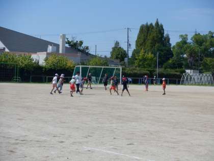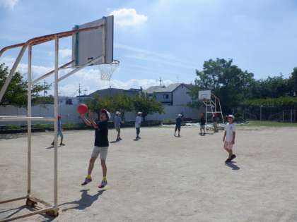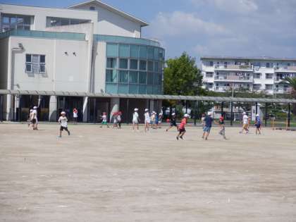 児童たちはグラウンドに出て、ドッジボール、サッカー、バスケットボール、鬼ごっこなどで遊んでいます。鬼ごっこで先生を捕まえたとおおよろこびする児童もいました。楽しそうです。