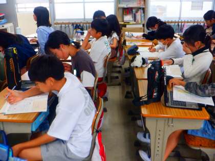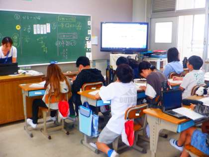 算数の授業の様子です。今日は、分数からの小数に表す方法を考えました。「分母÷分子」をしたらいいことがわかりました。最後は、練習問題に取り組みました。