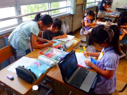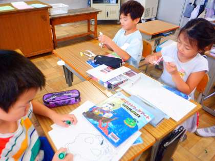 国語の授業の様子です。今日は、おすすめの本のポップづくりをしました。各グループで、本の面白いところを紹介したり、あらすじを書いたり、仕掛をつくるなど興味をもってもらう工夫をしました!!