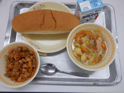 今日のメニューは、コッペパン、牛乳、マカロニスープ、チリコンカン、スティックチーズです。