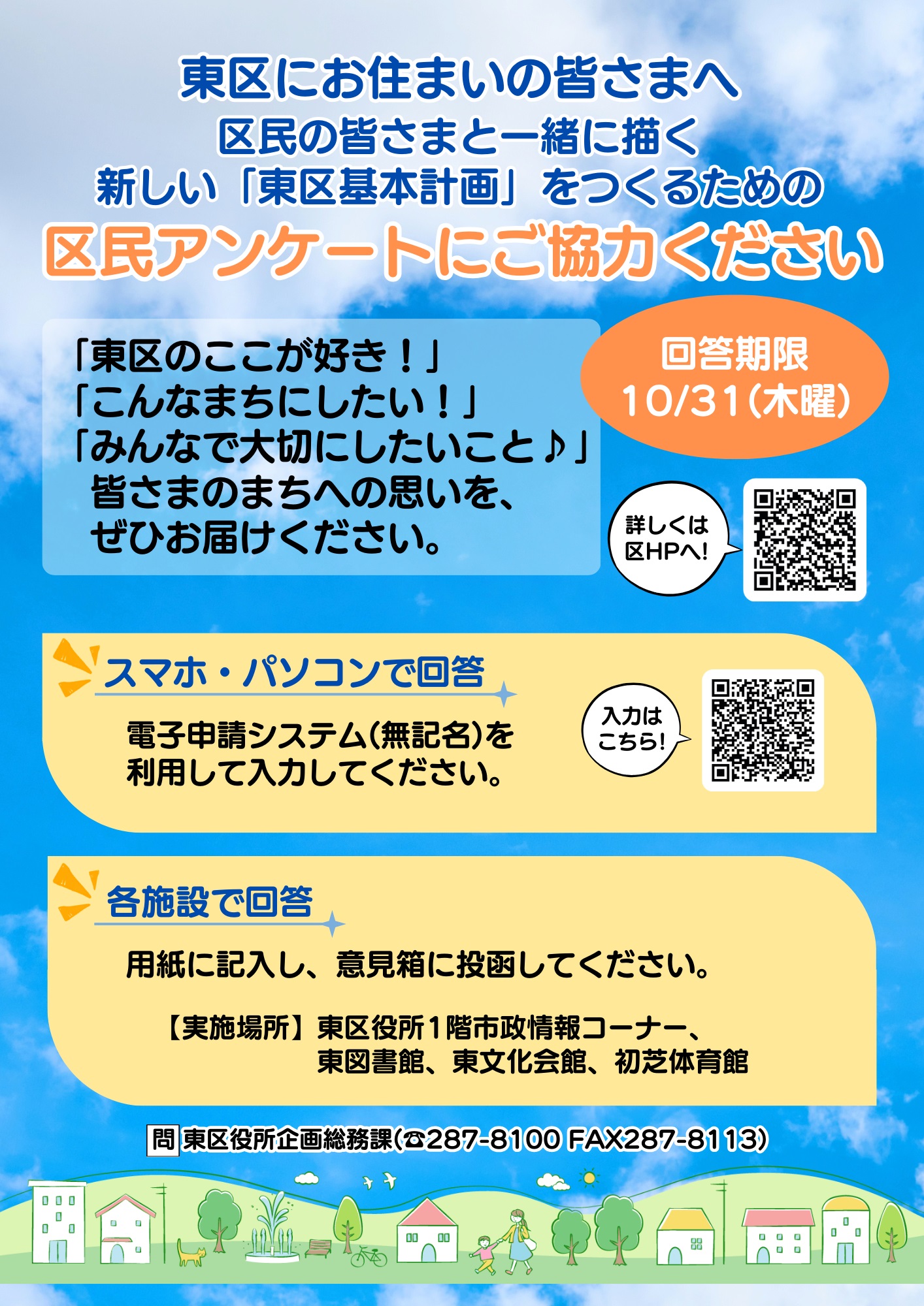 東区企画総務課より区民アンケートの協力に関する依頼がありました。詳しくは配布文書にポスターを掲示していますのでご確認ください。