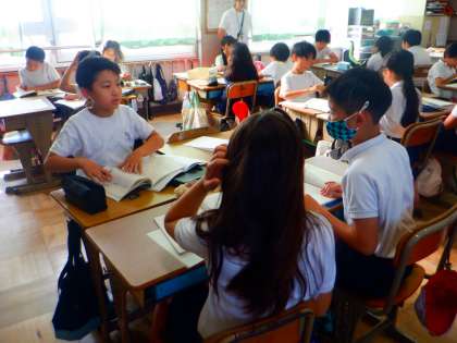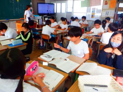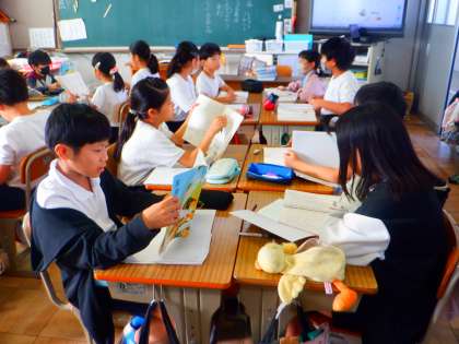 国語の授業の様子です。今日は、説明文『未来につなぐ工芸品』をはじめ・中・終わりに分け、要約をしました。各段落のキーワードとなる言葉をグループで探し、みんなで共有しました。