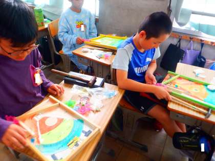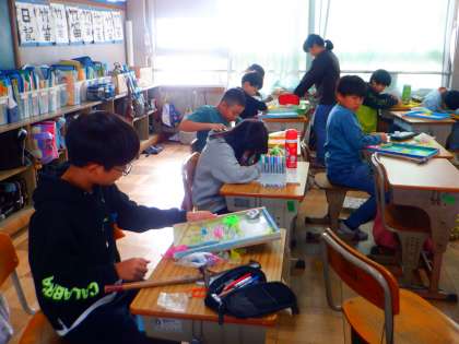 図工の授業の様子です。今日は、コリントゲームの釘打ちをしました。ビー玉を発射台から転がしながら、釘やベルなどの位置を決めて工夫しながら進めました。気をつけて金づちを使ってくださいね。