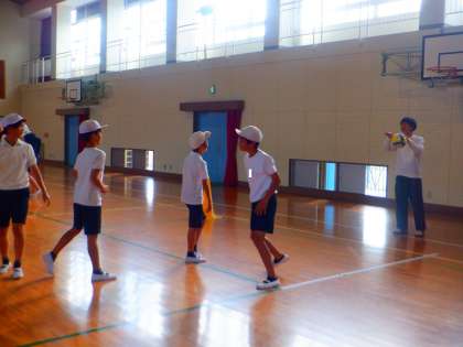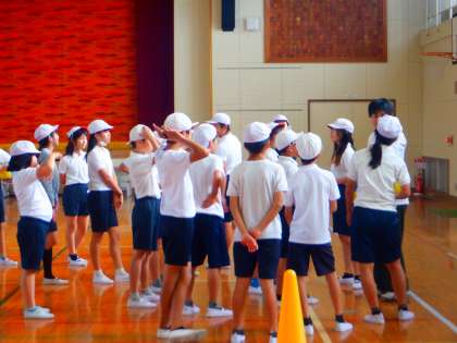 体育の授業の様子です。今日は、バレーボールをしました。各チームに分かれて、オバーハンドパスやアンダーハンドパス、円陣でパスを回す練習をしました。みんなでボールを繋げようとボールを追いかけてました。