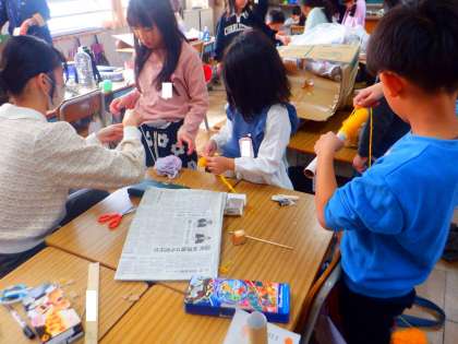 生活科の授業の様子です。日曜参観のおもちゃランドに向けて、今日は修復をしたり、補強したりと最終確認をしました!!待ち時間の時に引いてもらうおみくじを作ったり、ふわふわと毛糸を巻いて工夫をしていました。日曜日は頑張ってくださいね。